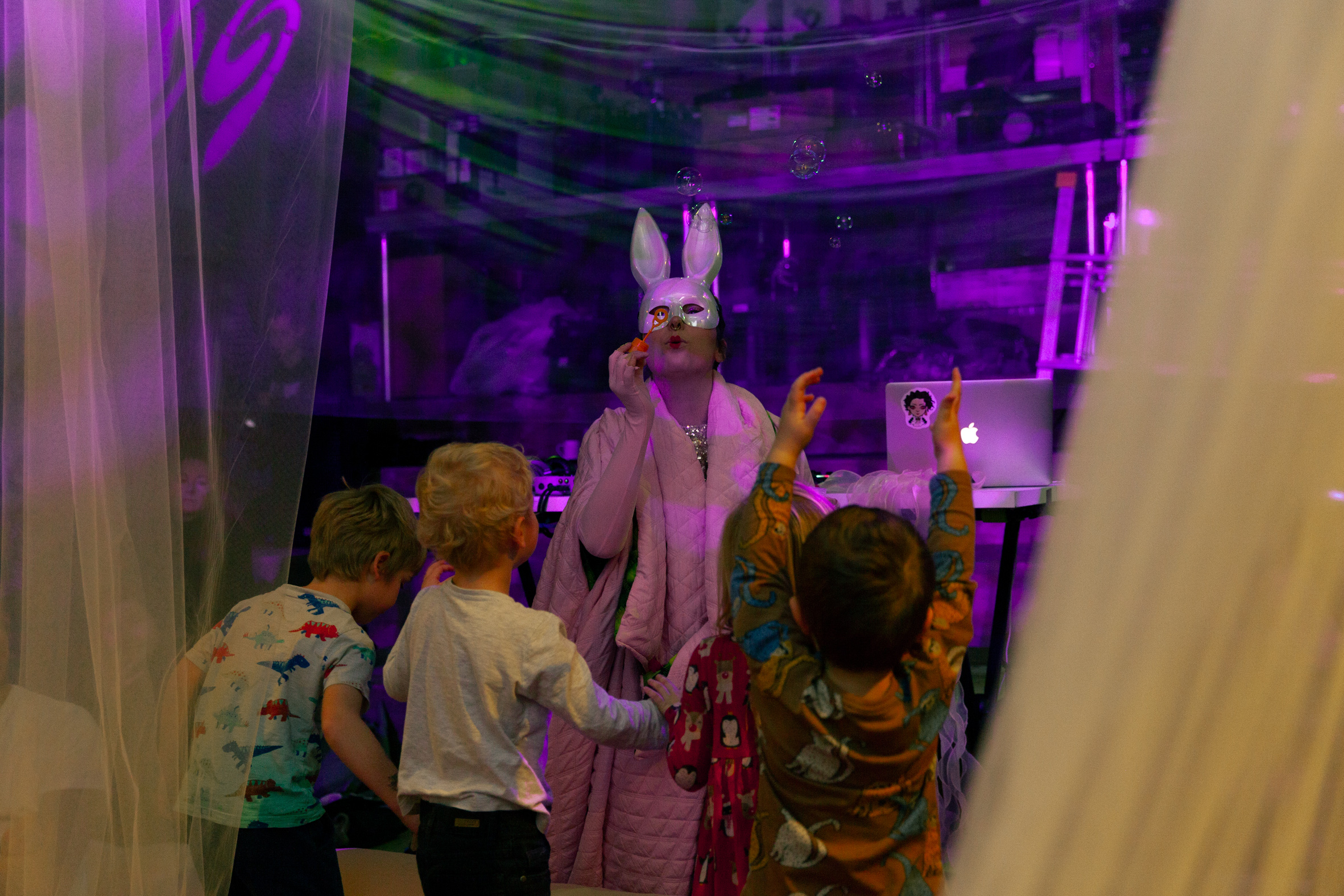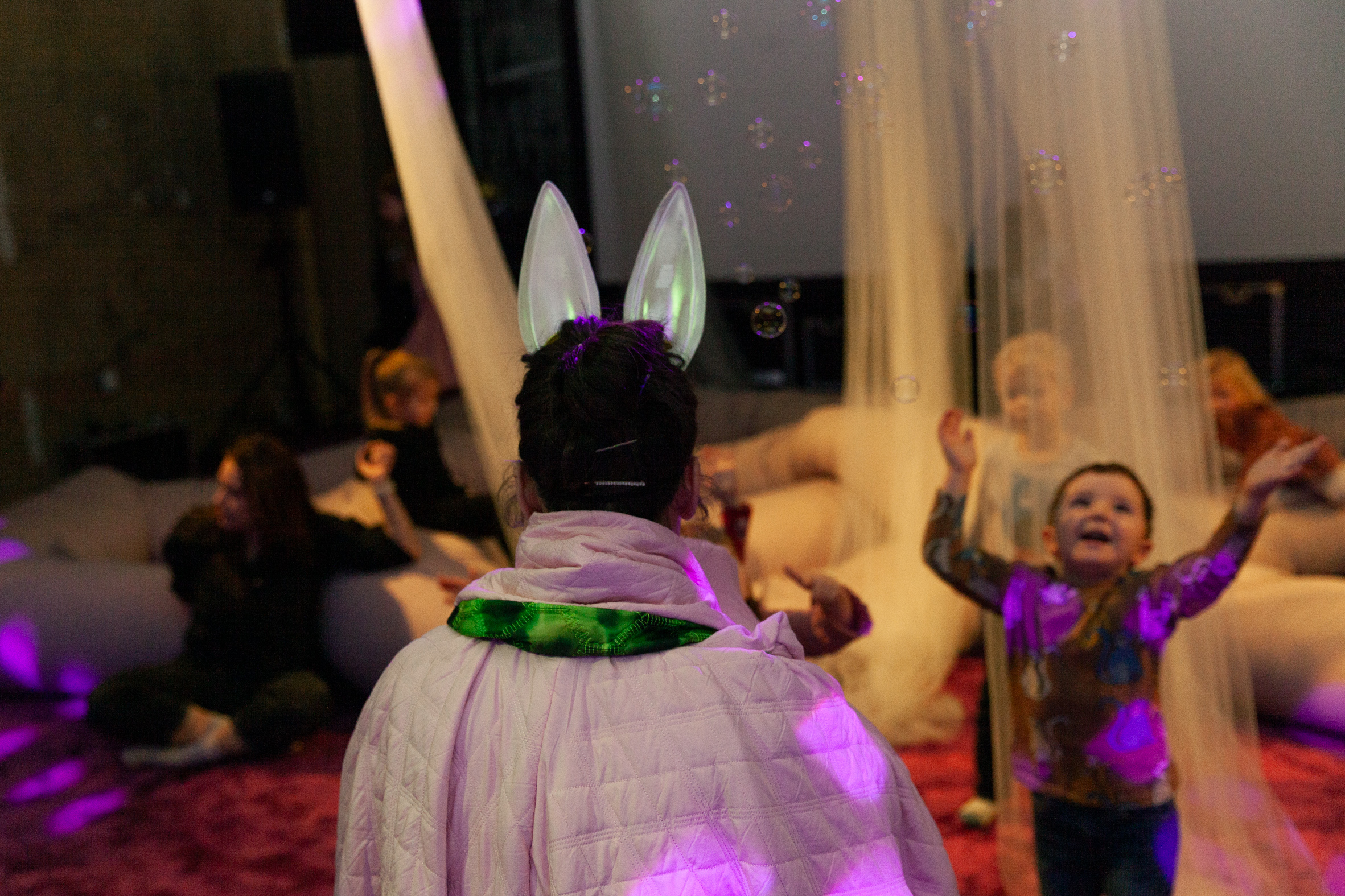 Atmosféru doplňuje divadelní hřiště – vnitřní herna se scénografickými a světelnými efekty a živým hudebním doprovodem DJky Tanity Yankové. Představení trvá přibližně 30 minut a probíhá za přítomnosti rodičů. Po skončení si děti budou moct v prostoru dál hrát.